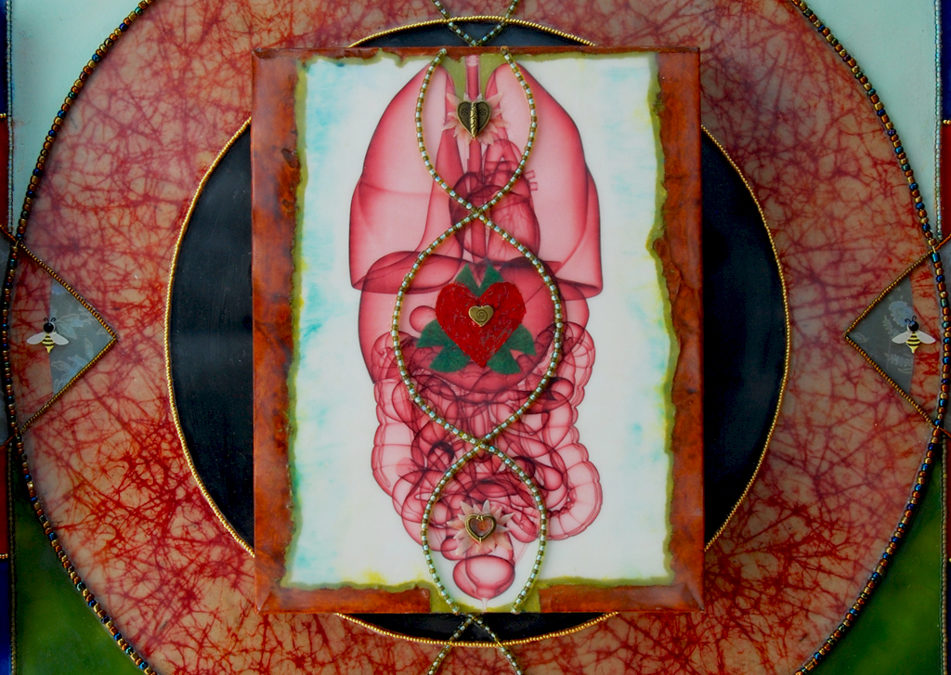 At first blush, you may ponder how this piece fits the theme… bee presence is minimal (can you find them?), and the relationship of the imagery to ‘Bees, Pollinators & Buddies’, isn’t obvious. Well, of course there is the fact that I use beeswax as my main media. Beyond this however, and consistent with my artistic approach, I explore the symbolic, trans-conscious level of our knowing. In this realm of the archetypal, experiences resonate with deeper truths, tap into patterns that are trans-personal, yet reverberate within.
