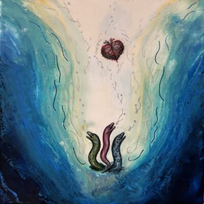These days, I’m contemplating the significance of water, specifically as a vehicle for transmitting information. Perhaps you are aware of Masaru Emoto’s experiments on the effects of words, music, and intentions upon water. To summarize, he exposed water to various harmonic or cacophonous sounds, (and loving or harsh words), then froze the water and photographed the resulting ice crystals using high-speed microscopic photography. Emoto reported that water exposed to positive words, (‘love’, ‘gratitude’) or harmonic sounds, formed beautiful, symmetrical, and aesthetically pleasing crystal structures, while water exposed to negative words or harsh music, like heavy metal, produced distorted and chaotic patterns. His work opened up the possibilities of a more expansive view of water. Are there other ways we might understand the interdependent nature of all life, and most notably the interplay of water creatures and the environment in which they live? Can water be a medium through which healing happens? Information is shared? Sound travels ~ 4.4 % faster through water than air. Can sound through water be a form of communication? creation? Given a human fetus grows in fluid, and water comprises ~ 60% of a person, perhaps we can explore new dimensions for shifts within ourselves, using sound? Certainly, we can glean amazing wisdom and insights from highly evolved water creatures. Here are 3 art works exploring these ideas; mark making in the forms of glyphs, sigils and undulating lines, are the resonant new language.