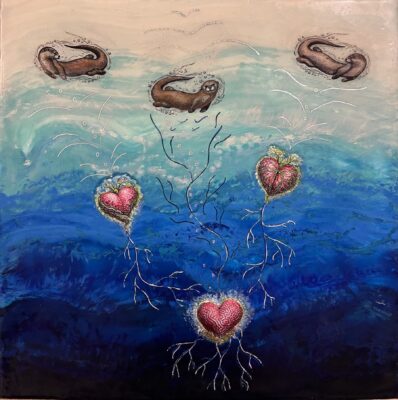 Here, a beautiful trio of otters and hearts, contribute to the vision of growing hearts together. The heart at bottom is more brain like in its’ surface rendering; the one’s floating above it, reveal more of the heart’s vascular system, sprouting forth connection from their tops. Each ‘heart’ is connected to one otter; each ‘pair’ is co-nourished, and contributes to the triumphant gathering of Joyful frequencies.