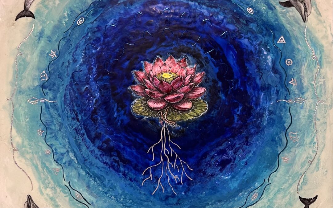 To me, dolphins hold memory, wisdom and practices to maintain harmony within ever-fluctuating ecosystems. As guardians, they teach us how to focus and enliven these frequencies. Four dolphins, one in each corner, creates stability for the circle to keep moving, evolving. Toning sounds of peace, transition, and emergence, dance through the waters. We are aware of the dark depths where conception takes root, and the steady path towards emergent beauty, a flowering of potential. An ever-evolving flow of life, growth, death, rebirth. I honor the dolphins for their capacity to instill within humanity the possibility of living in higher frequencies founded upon love, compassion and joy.