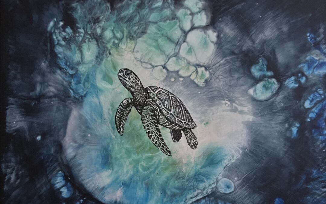 The piece on the left, (Descending), was a field of color for months, and only recently became inhabited by the turtle; as a symbol of Mother Earth, and self, we are going through enormous emotional upgrades. Watery environments within my dreamscapes have emerged onto the panels… the turtle both descends into the