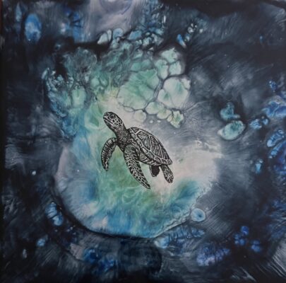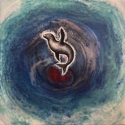 depths, and in this next work (on the right), ascends, swimming upwards towards the surface. I ask “are we looking for the path to a lighter frequency through the chaos of all that is breaking down?” I am.
