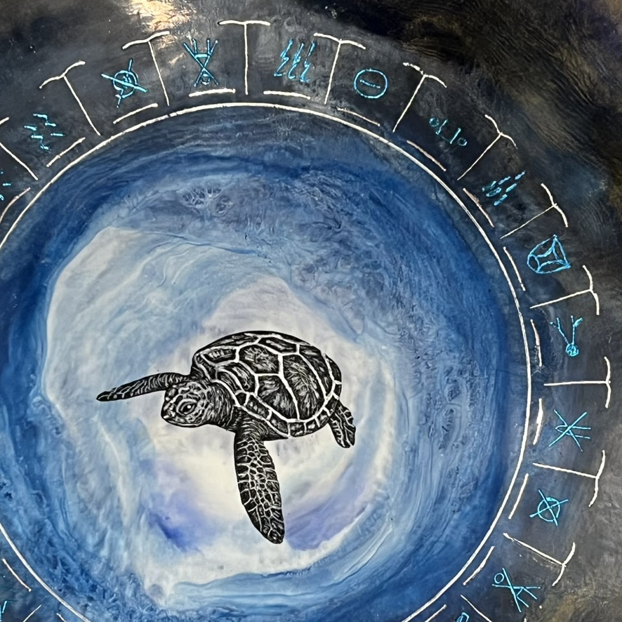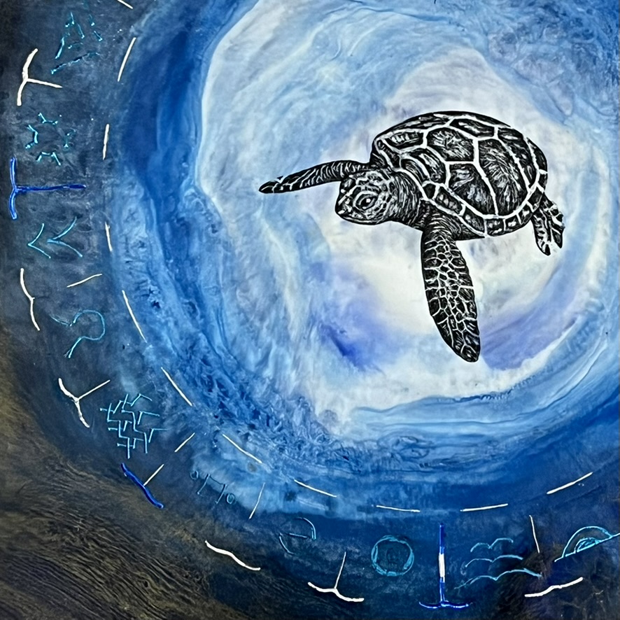 The essence of this artwork is encapsulated in the prose poem above; a ring of 24 glyphs, each representing a word’s energy, follows the journey along the circumference. The circular compass holds the watery space, protecting the creature within. The turtle, as symbol of an individual (me, you…) and Gaia (planet Earth), descends into a dark, liminal experience, where time, space and known reality dissolves. Many myths (Odysseus, Persephone, Inanna), speak to this process of periodic renewal; evolution along the soul’s path is only possible when one submerges into shadow territory, which reveals dead, crusty, outdated beliefs, stories and behaviors. If resisted, we continue to half-exist in Maya, the illusory field we call reality. Cycles are coinciding, creating the chaos and pressure we are all feeling to change. Frightening? Yes. Dissolution challenges our need for an identifiable self. But as all great sages suggest, it is essential to get at the beauty that lies within.