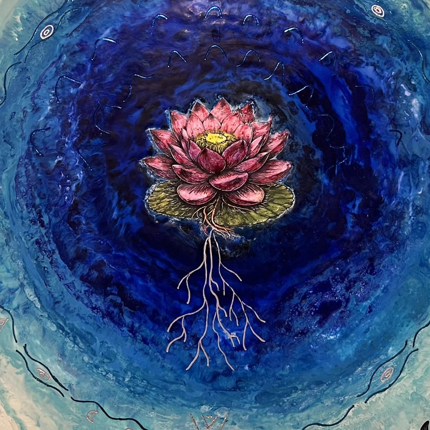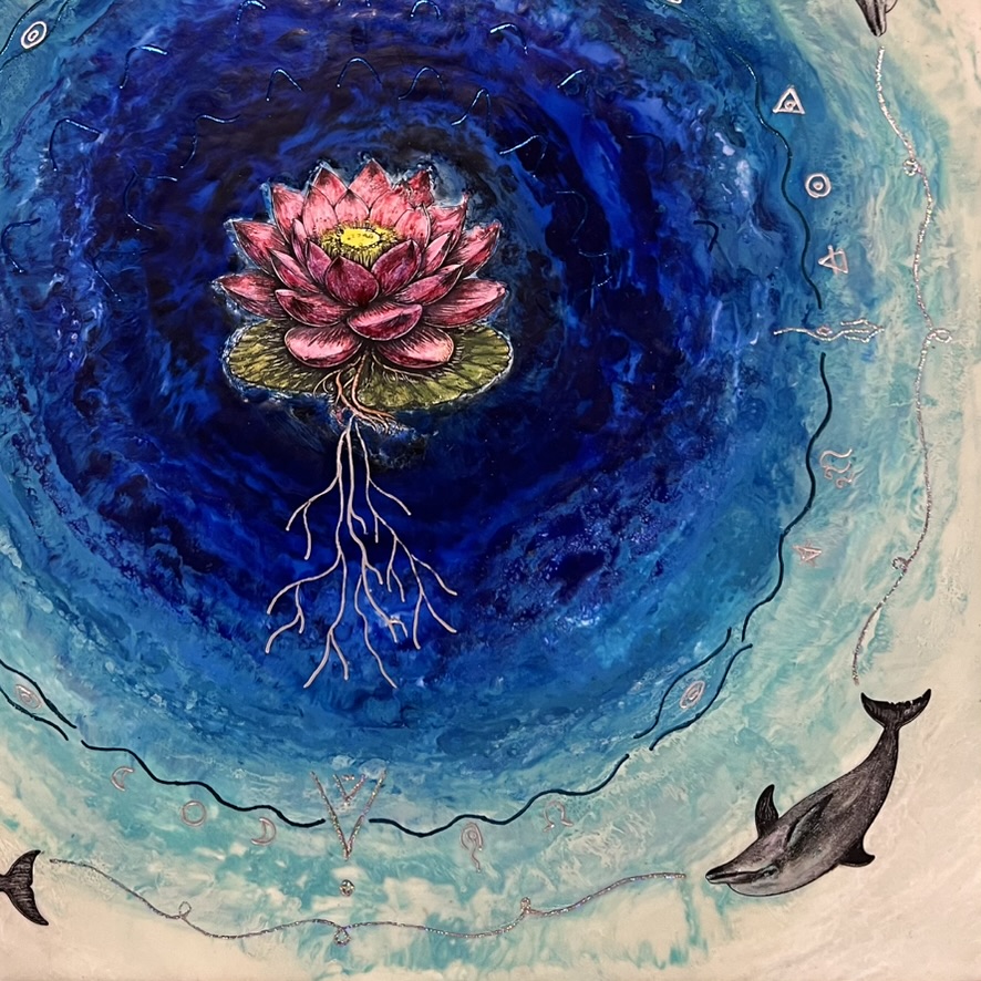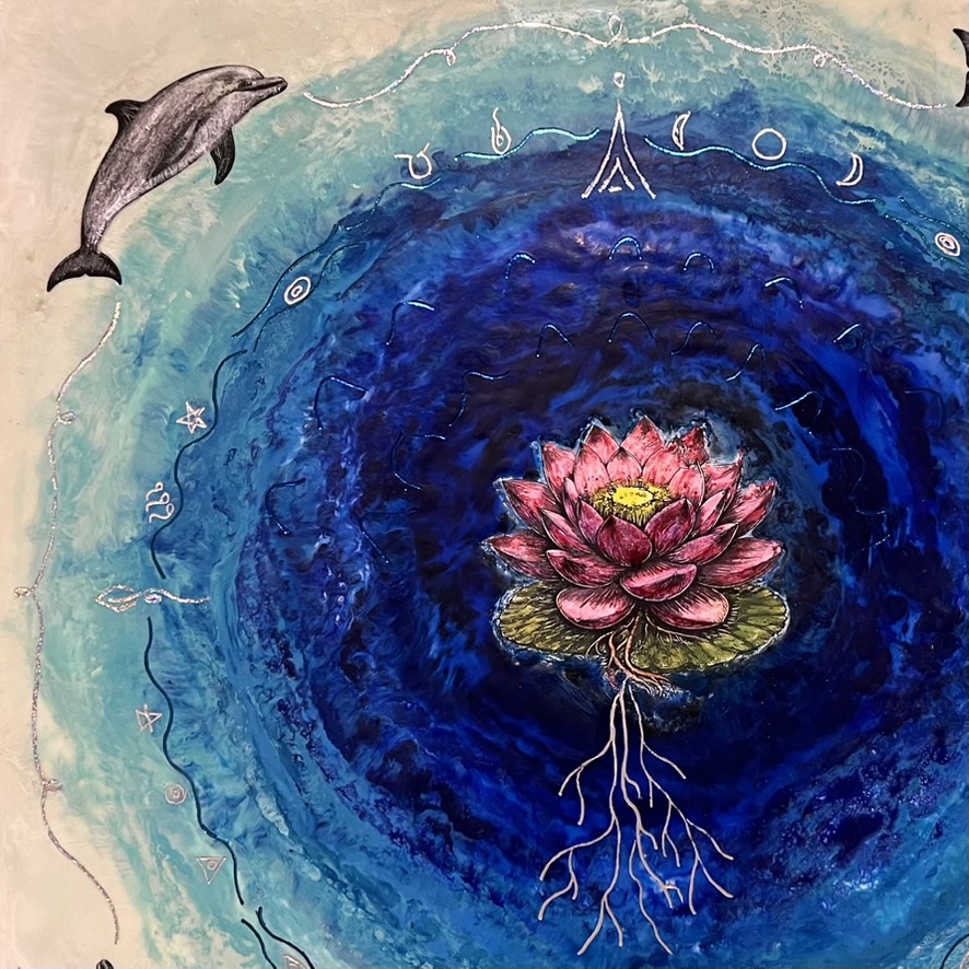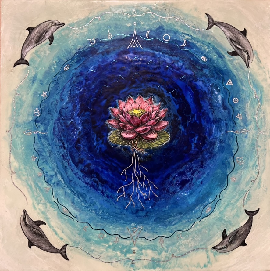 To me, dolphins hold memory, wisdom and practices to maintain harmony within ever-fluctuating ecosystems. As guardians, they teach us how to focus and enliven these frequencies. Four dolphins, one in each corner, creates stability for the circle to keep moving, evolving. Toning sounds of peace, transition, and emergence, dance through the waters. We are aware of the dark depths where conception takes root, and the steady path towards emergent beauty, a flowering of potential. An ever-evolving flow of life, growth, death, rebirth. I honor the dolphins for their capacity to instill within humanity the possibility of living in higher frequencies founded upon love, compassion and joy.